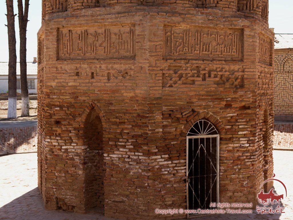 The Jarkurgan Minaret (1109 – 1110) stands in the village of Minar, Jarkurgan District. In the old days, nearby there was a cathedral mosque built of burnt brick. But it has not survived to our days. The base of the minaret is octagonal. A sixteen-sided body of the minaret decorated with figured brickwork rests on it/ archways are made at the height of 20 meters with a band of inscriptions in the kufic script above them. There are facets of stalactites over this band; however, the upper part of the minaret has not survived. Among the drawings made by the Russian explorer, N.N. Karazin, there are pictures of the Jarkurgan Minaret and the ruins of the nearby mosque (1879). The height of the minaret is 21,6 m, its width at the bottom is 5,4 m. the name of the master (Ali ibn Muhammad as-Sarakhsi) and the year of construction (fist read by V.A. Shishkin) are written on one the ribs. The inscriptions are placed on the minaret’s base facets and body as well as its upper part. The script used is kufic.